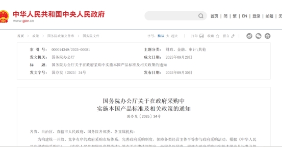 国办印发《关于在政府采购中实施本国产品标准及相关政策的通知》