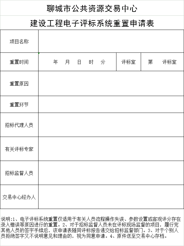 聊城市公共资源交易中心建设工程电子评标系统重置申请表